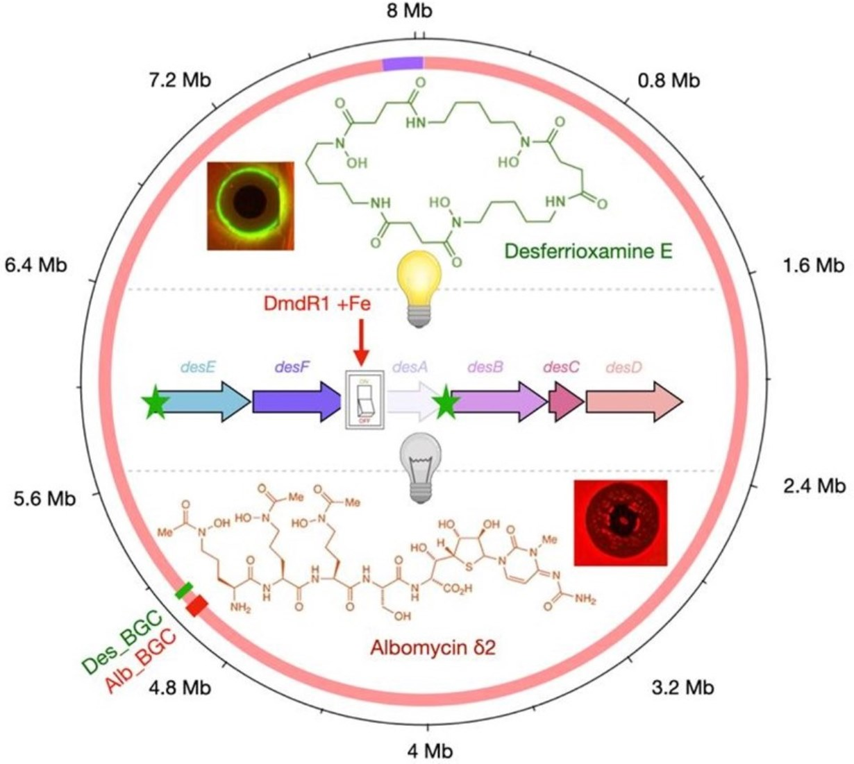 In the present study, we identified the strain S. globisporus bja209 capable of biosynthesizing two compounds with distinct mechanisms of action—albomycin δ2 and desferrioxamine E. The production of each metabolite was regulated by specific culture medium components. Furthermore, using a reporter system, we have for the first time characterized desferrioxamine E’s mechanism of action, which was associated with induction of the SOS-response in E. coli. Additionally, our findings demonstrated that both desferrioxamine E and albomycin δ2 exhibit efficacy against a range of clinically relevant bacterial pathogens.