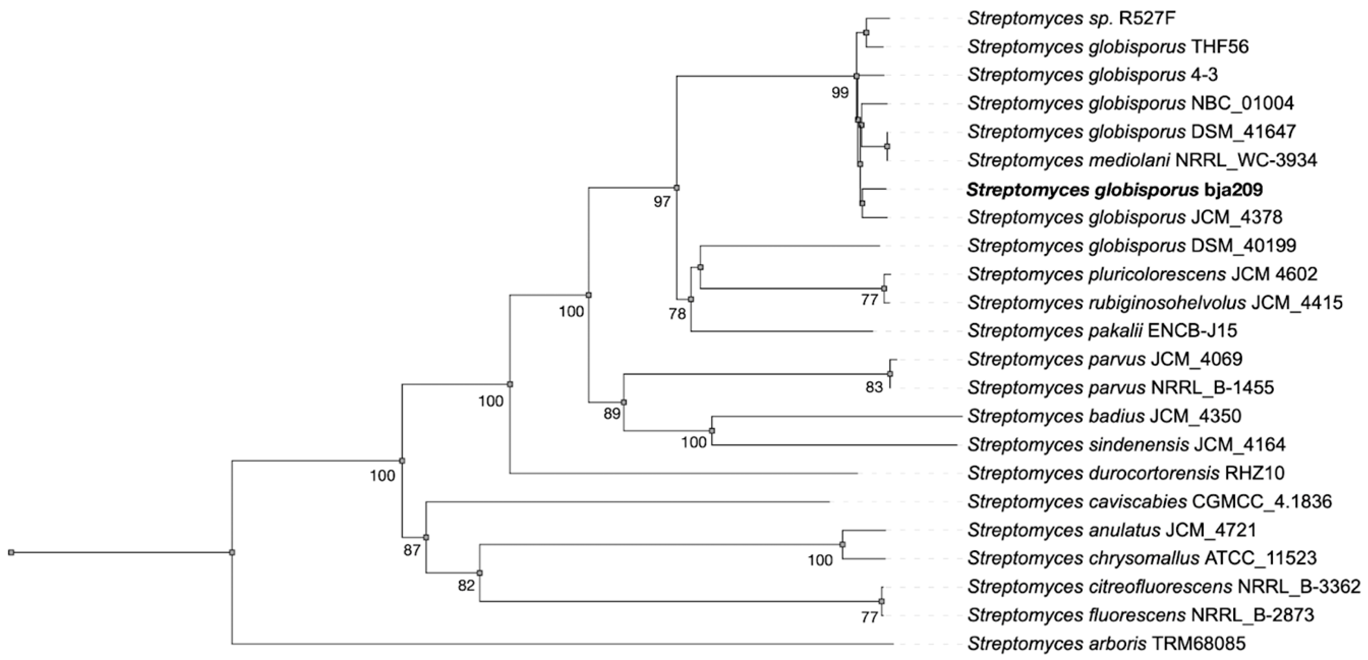 Neighbor-joining phylogenetic analysis based on both 16S rRNA and whole-genome sequences from the TYGS database and GeneBank confirmed that bja209 belongs to the species S. globisporus. Accordingly, we designate this strain as S. globisporus bja209.