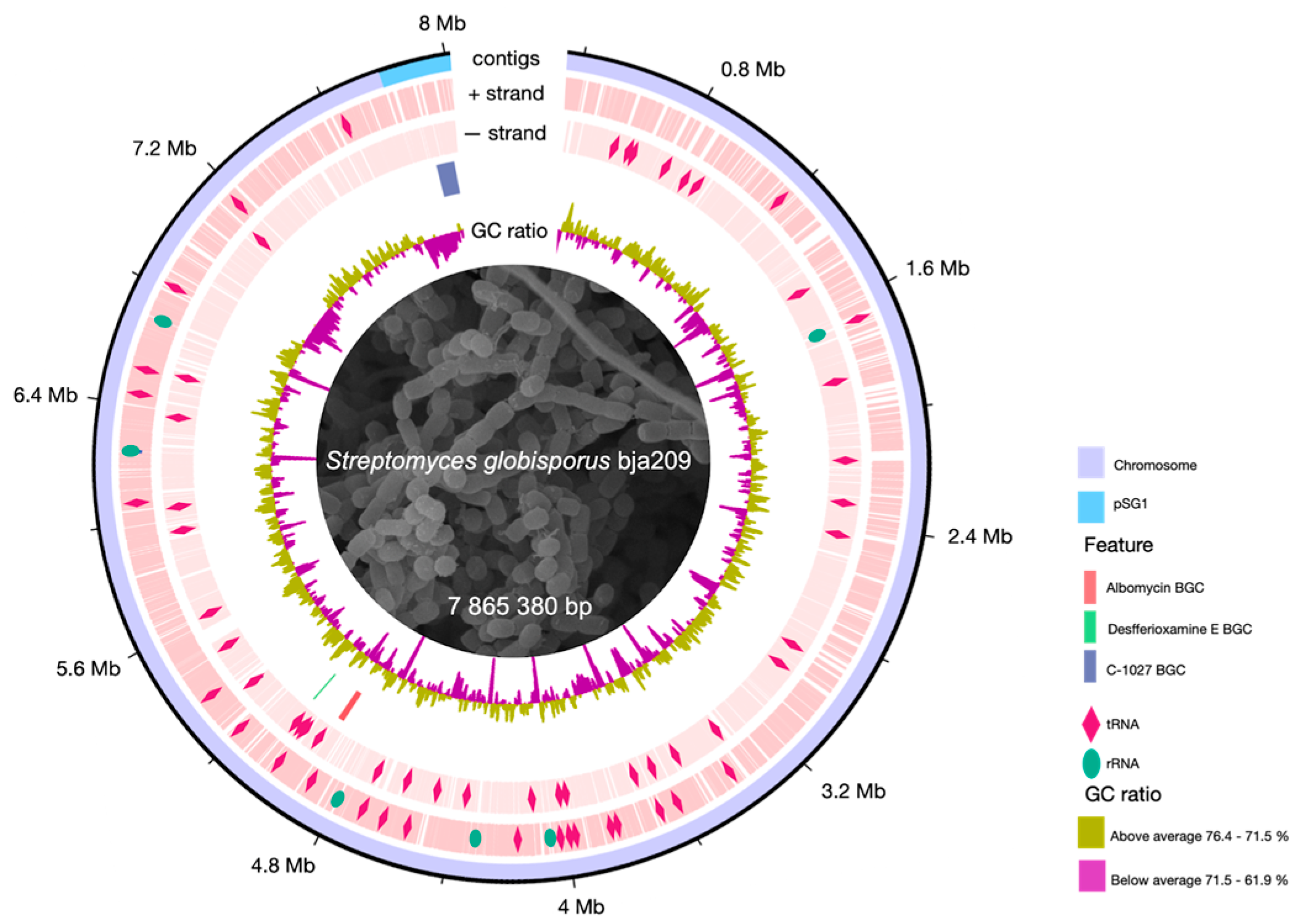 The genome of strain bja209 comprises a 7,865,380 bp chromosome and a 165,749 bp linear plasmid, totaling 8,031,129 bp. The DNA G+C content is 71.42%, which is consistent with the G+C content of the genus members of