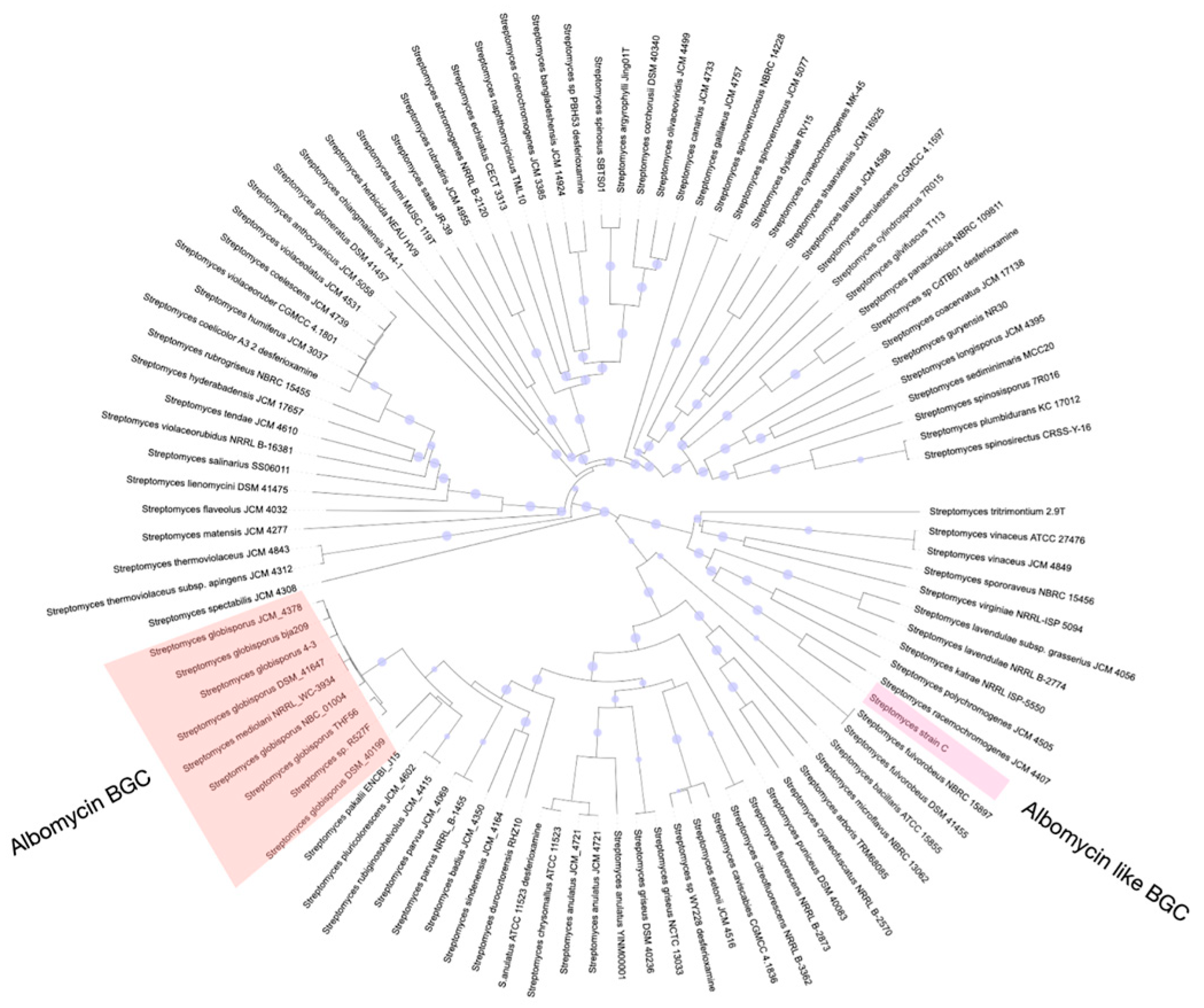 2.6. Albomycin δ2 BGC and Its Phylogenetic Distribution