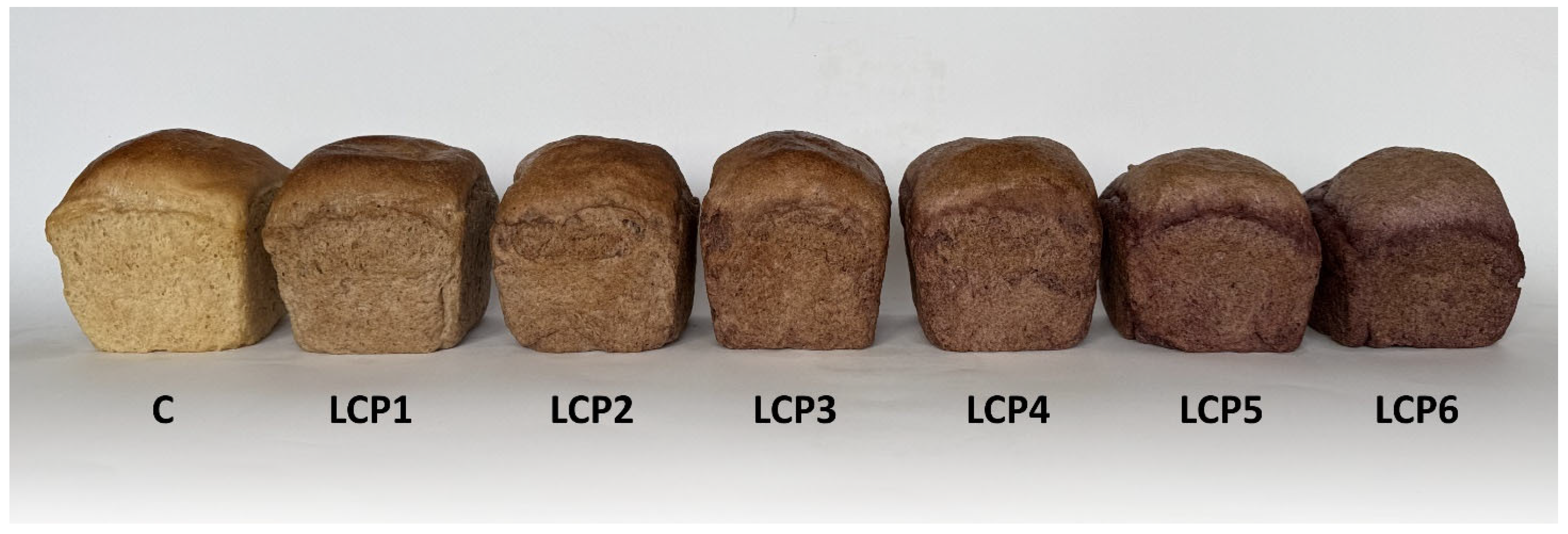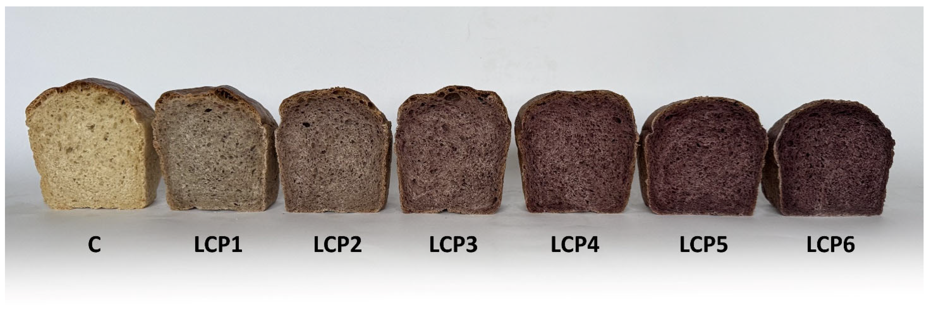 Furthermore, incorporating LCP into bread formulations may influence the release and bioavailability of bioactive compounds, including polyphenols and dietary fiber, through both compositional and structural modifications of the bread matrix. Thermal processing during baking can facilitate the partial release of phenolic compounds bound to plant cell walls, potentially enhancing their bioaccessibility and antioxidant activity [