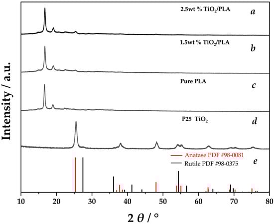 XRD pattern of the reactor printed using 2.5 wt% TiO2/PLA (a), 1.5 wt% TiO2/PLA (b), pure PLA (c) as raw material, TiO2 powder (d) and PDF card of TiO2 (anatase and rutile phase) (e).