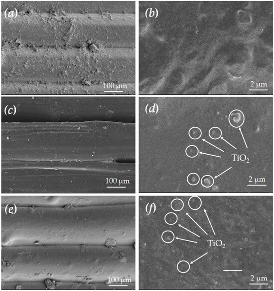 SEM of N-PCR surface ((a,b): fabricated using pure PLA; (c,d): fabricated using 1.5 wt% TiO2/PLA; (e,f): fabricated using 2.5 wt% TiO2/PLA).