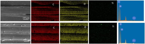 Figure 3 and Figure 4 show the SEM and EDS images of N-PCR fabricated by fused deposition modeling (FDM), respectively. It can be observed that FDM employs a layer-by-layer additive manufacturing approach, resulting in a relatively rough surface. The presence of TiO2 distributed within the TiO2/PLA-based PCR matrix is evident. As the proportion of TiO2 in the TiO2/PLA composite filament increases, the gaps in the N-PCR produced by FDM printing are significantly reduced, which may be attributed to the intermolecular interactions between TiO2 and PLA.