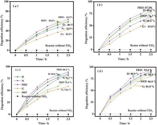 Degradation efficiency of TPMS PCRs printed by 1.5 wt% ((a): horizontal flow field; (b): rotational flow field), 2.5 wt% TiO2/PLA melt ((c): horizontal flow field; (d): rotational flow field) and reactor without TiO2.