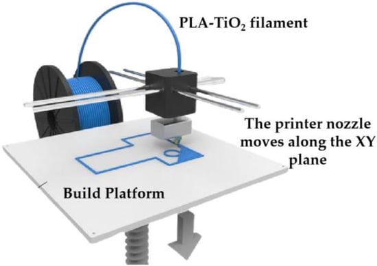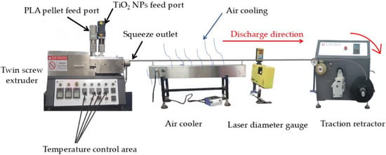 Titanium dioxide nanoparticles (TiO2 NPs) and PLA raw pellets were pre-dried separately at 120 °C for 4 h. The TiO2 NPs were incorporated at mass fractions of 1.5% and 2.5%. After drying, the mixtures were gradually fed into the extruder through the feeding zone. The temperature profile of the twin-screw extruder was set as follows: Zone 1: 175 °C, Zone 2: 185 °C, Zone 3: 190 °C, Die Zone 1: 180 °C, and Die Zone 2: 175 °C. The composites were melt-blended at high temperatures and extruded through the discharge outlet. The extruded filament was cooled in an air-cooling chamber and then passed through a laser diameter gauge before being directed into the traction winder (Figure 6).