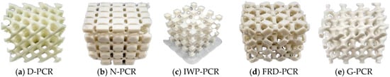To overcome these limitations and fully leverage the design freedom offered by 3D printing, this study introduces a new paradigm by integrating Triply Periodic Minimal Surfaces (TPMS) topology with one-step FDM fabrication of catalyst-embedded monolithic structures. TPMS are abstract, mathematically defined structures (e.g., Gyroid (G), Diamond (D), and Fischer-Radin-Dunn (FRD)) that exhibit periodicity in all three spatial dimensions and maintain zero mean curvature [16,17,18,19]. Figure 1 shows the TPMS types and their corresponding unit cells. They translate mathematical elegance into exceptional engineering performance: offering extremely high specific surface area, fully interconnected channels (ensuring excellent mass transfer), self-supporting robust structures, and highly tunable geometric parameters [20]. These inherent properties make TPMS structures ideal candidates for next-generation photocatalytic reactors. However, compared to their applications in other fields such as biomedicine or heat exchange, this potential remains underexplored.