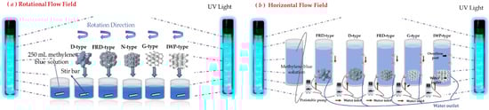 The photocatalytic activities of the five three-dimensional printed TPMS-PCRs (IWP, G, N, D, and FRD) were evaluated by monitoring the degradation of methylene blue (MB) under irradiation in two different flow field configurations (horizontal and rotational, as illustrated in Figure 9).
