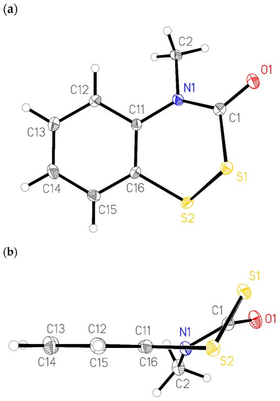 (a) Anisotropic displacement ellipsoid plot of dithiazinone 3, drawn at the 50% probability level. All non-H atoms are labeled and numbered. The crystallographic numbering scheme differs from IUPAC numbering. (b) On-edge view showing the deviation from planarity.