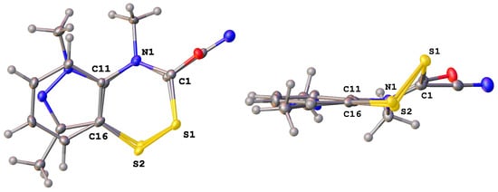 Compound 3 was compared to somewhat related compounds previously reported in the literature (Table 1, Scheme 5). The dihedral (torsion) angle of the C–S–S–C (C1–S1–S2–C16) group in 3 is −58.36(8)°, in contrast with the near-zero values of the corresponding dihedral angle seen in planar five-membered heterocyclic disulfides like 3-ethoxy-1,2,4-dithiazolin-5-one (EDITH) [26,27] and 1,2,4-dithiazolidine-3,5-dione (DtsNH) [26], and also in contrast with the preferred disulfide dihedral angle of 90° for acyclic disulfides, including those found in simple compounds [28,29], in cystine alone [30], or in cystine residues that are incorporated into peptides and proteins [31]. On point, a C–S–S–N torsion angle of −92.62(6)° is found in (N-methyl-N-phenylamino)(N-methyl-N-phenylcarbamoyl)disulfane (6) [13], which can be thought of as a linearized analogue of 3. On the other hand, the S–S bond length in heterocyclic 3, namely 2.0580(6) Å, is quite close to the corresponding value for linear 6, namely 2.0625(5) Å.