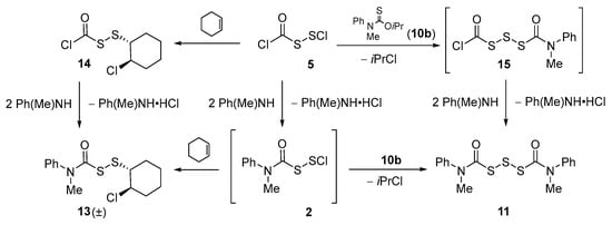 (N-Methyl-N-phenylcarbamoyl)disulfanyl chloride (2), generated by reaction of limiting secondary amine with 5, was trapped successfully by a number of precedented techniques [1,2,3,13] to give the expected adducts, some new and others previously known. For example, trapping of 2 with cyclohexene gave the novel 2-chlorocyclohexyl(N-methyl-N-phenylcarbamoyl)disulfane (13) (racemic mixture), in a ratio of ~1:1 with the corresponding known sulfide [1], and reaction of 2 with thiocarbamate 10b (1 equiv) gave bis(N-methyl-N-phenylcarbamoyl)trisulfane (11) [3] (see also footnote 10). In each case, the same end products could be obtained by first treating (chlorocarbonyl)disulfanyl chloride (5) with either cyclohexene or the thiocarbamate to provide relatively unstable derivatives [disulfane 14 and trisulfane 15, respectively], which were then quenched with N-methylaniline (Scheme 2).