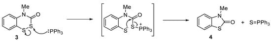 Reaction of 4-methyl-2(3H)-benzo-1,2,4-dithiazinone (3) with triphenylphosphine to cleanly provide 3-methyl-2(3H)-benzothiazolone (4), together with triphenylphosphine sulfide. The species shown in the middle of the Scheme is a plausible intermediate for this transformation, and the arrows indicating movements of electrons are suggestive of the likely mechanism, including identification of the “active” sulfur atom which happens to be the out-of-plane sulfur in the X-ray structure of 3 (see Section 2.4). Compare this proposed mechanism to the elegant work of Hanusek et al. [23,24,25], who elucidated mechanisms for the desulfurization of EDITH and related compounds with P(III) reagents.