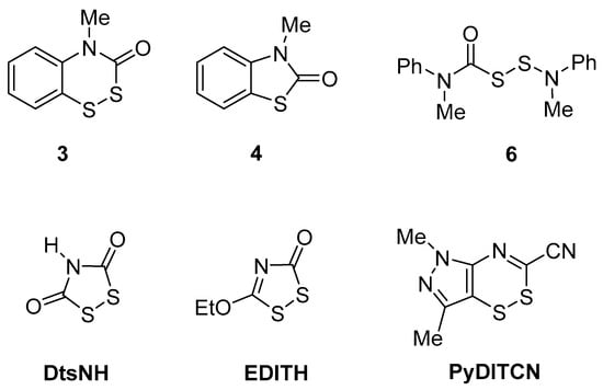 Only one structure, namely 1,3-dimethyl-5H-pyrazolo[3,4-e][1,2,4]dithiazine-3-carbonitrile (PyDITCN) [33], was found to be extraordinarily similar to 3 (Figure 3). Both compounds feature a six-atom heterocyclic C–N–C–S–S–C group fused to an aromatic ring (benzene for 3; 1H-pyrazole for PyDITCN). In both cases (3 and PyDITCN), the N and C atoms in the dithiazine ring are sp2 hybridized, thus differentiating them from other compounds which have sp3 hybridized carbon atoms bonded to S (see previous paragraph). The adjacent aromatic ring causes the disulfide-containing heterocycle to deviate from planarity (0.292 Å in PyDITCN; 0.328 Å in 3), and forces significant pucker of a sulfur atom to preclude the formation of an antiaromatic ring with eight π electrons. In contrast, the comparison five-membered heterocyclic disulfides DtsNH and EDITH have six π electrons, and the aromatic stabilization from planarity takes priority over the maximally unfavorable disulfide dihedral of 0°.