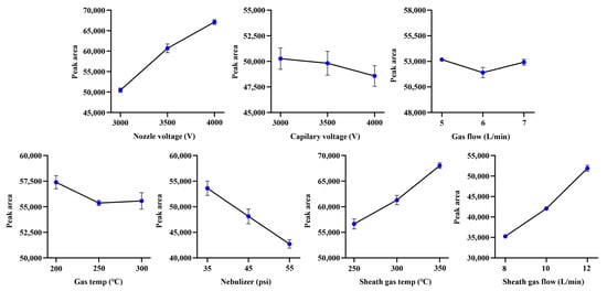 In order to maximize the sensitivity of the developed method for α-cyperone as much as possible (Figure 1), a single factor experiment with seven factors and three levels was performed. As the optimization results, sheath gas temp (250–350 °C), sheath gas flow (8–12 L/min), and nozzle voltage (3.0–4.0 kV) could enhance the response of α-cyperone in a level-dependent manner. Conversely, the optimal sensitivity of α-cyperone for capillary voltage (3.0–4.0 kV), nebulizer (35–55 psi), gas flow (5–7 L/min), and gas temp (200–300 °C) was achieved at the lowest level (Figure 2). As a result, the ion source parameters were established as follows: gas temp, 200 °C; gas flow, 5 L/min; nebulizer, 35 psi; sheath gas temp, 350 °C; sheath gas flow, 12 L/min; capillary voltage, 3.0 kV; and nozzle voltage, 4.0 kV.