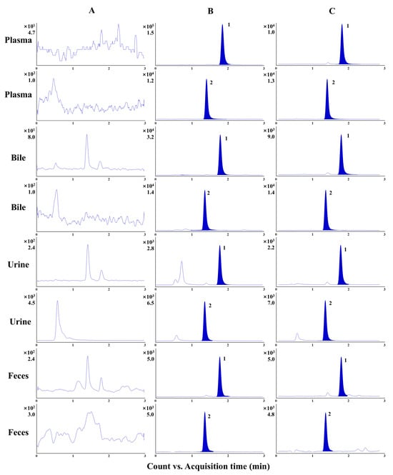 The representative MRM chromatograms of plasma, bile, urine, and feces from a blank sample (A), a sample after administration at the earliest period (B), and a QC sample at a low concentration level (C). The numbers 1 and 2 represent α-cyperone and alantolactone, respectively.