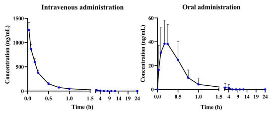 The plasma concentration–time profiles of α-cyperone after intravenous administration (4 mg/kg) and oral administration (20 mg/kg) (n = 6, mean ± SD).