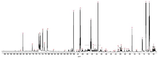 Assignment of metabolites in a typical H-CPMG spectrum of culture medium. The water signal has been excluded from the spectrum. The region of the spectrum between 5 and 9 ppm has been expanded. The assignment of metabolites is: (1) Leucine (left 0.97 ppm and right 0.94 ppm); (2) Valine (left 0.99, 1.05 ppm and right 0.97, 1.01 ppm); (3) Isoleucine (left 1.01 ppm and right 0.99 ppm); (4) Propylene glycol (left 1.12 ppm and right 1.10 ppm); (5) Ethanol (left 1.20, 3.68 ppm and right 1.17, 3.62 ppm); (6) 3 Hydroxybuyrate (left 1.22 ppm and right 1.20 ppm); (7) 3-hydroxyisovalerate (left 1.28 ppm and right 1.27 ppm); (8) Lactate (left 1.34, 4.13 ppm and right 1.29, 4.07 ppm); (9) Alanine (left 1.50 ppm and right 1.45 ppm); (10) Lysine (left 1.75, 3.03 ppm and right 1.70, 3.01 ppm); (11) Acetate (left 1.93 ppm and right 1.89 ppm); (12) Glutamate (left 2.08, 2.35 ppm and right 2.04, 2.32 ppm); (13) Methionine (left 2.14, 2.66 ppm and right 2.12, 2.62 ppm); (14) Acetone (left 2.23 ppm and right 2.21 ppm); (15) Pyruvate (left 2.37 ppm and right 2.35 ppm); (16) Pyroglutamate (left 2.39, 2.53, 4.19 ppm and right 2.37, 2.47, 4.14 ppm); (17) Glutamine (left 2.45 ppm and right 2.43 ppm); (18) Citrate (left 2.67 ppm and right 2.66 ppm); (19) 2-oxoglutarate (left 2.99 ppm and right 2.97 ppm); (20) Ornithine (left 3.05 ppm and right 3.04 ppm); (21) Choline (left 3.19 ppm and right 3.18 ppm); (22) Methanol (left 3.37 ppm and right 3.32 ppm); (23) Glucose (left 3.91, 5.24 ppm and right 3.21, 5.19 ppm); (24) Glycine (left 3.56 ppm and right 3.55 ppmc; (25) Isopropanol (left 4.04 ppm and right 3.99 ppm); (26) Threonine (left 4.27 ppm and right 4.23 ppm); (27) Uracil (left 5.81 ppm and right 5.78 ppm); (28) Fumarate (left 6.52 ppm and right 6.49 ppm); (29) Tyrosine (left 6.93, 7.22 ppm and right 6.86, 7.15 ppm); (30) Histidine (left 7.11, 7.87 ppm and right 7.05, 7.82 ppm); (31) Phenylalanine (left 7.47 ppm and right 7.30 ppm); (32) Tryptophan (left 7.55, 7.75 ppm and right 7.52, 7.70 ppm); (33) Formate (left 8.48 ppm and right 8.42 ppm); (34) Nicotinate (left 8.62 ppm and right 8.58 ppm).