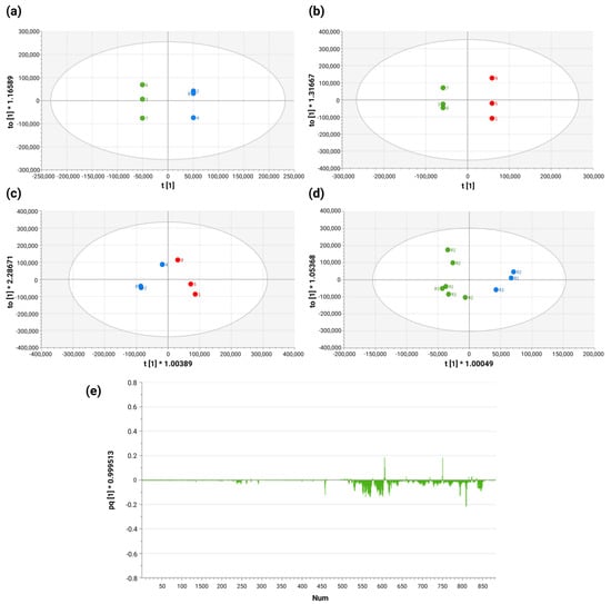 Orthogonal Partial Least Squared Discriminant Analysis (OPLS-DA) score plots for the comparison between: (a) C-33 A vs. Ca Ski, (b) C-33 A vs. SiHa and (c) Ca Ski vs. SiHa. In panels (a–c), the green color (●) represents the C-33 A cell line, in blue color (●) the Ca Ski cell line, and in red color (●) the SiHa cell line. (d) OPLS-DA score plots of comparison between HPV 16-positive (green ●) and HPV 16-negative (blue ●) cells. (e) Loading plot of OPLS-DA score plot.