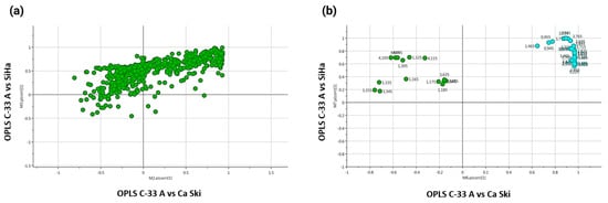 SUS-plot graphs of comparison of OPLS-DA models of the negative HPV 16 cell line (C-33 A cells) and both positive HPV 16 cell lines (SiHa and Ca Ski). (a) SUS-plot plots of comparison of OPLS-DA models between C-33 A vs. Ca Ski and C-33 A vs. SiHa. (b) SUS-plot between C-33 A vs. Ca Ski and C-33 A vs. SiHa considering only the metabolites with a VIP greater than 1.5 and are common between both models.