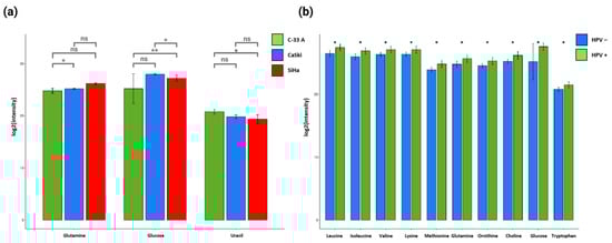 Concentration of metabolites in the C-33 A, SiHa, and Ca Ski cell lines. The logarithmic bar graph in (a) represents the intensity of the metabolites in the three cell groups: C-33 A (green bars), Ca Ski (blue bars), and SiHa (red bars). The logarithmic bar graph in (b) represents the intensity of the metabolites when comparing HPV 16 positive (SiHa and Ca Ski) and negative (C-33 A) cell lines. The intensity of the metabolites was analyzed in GraphPad Prism 8 software using Student’s t test. ns (not significant). Statistical significance: * p < 0.05, ** p < 0.01.