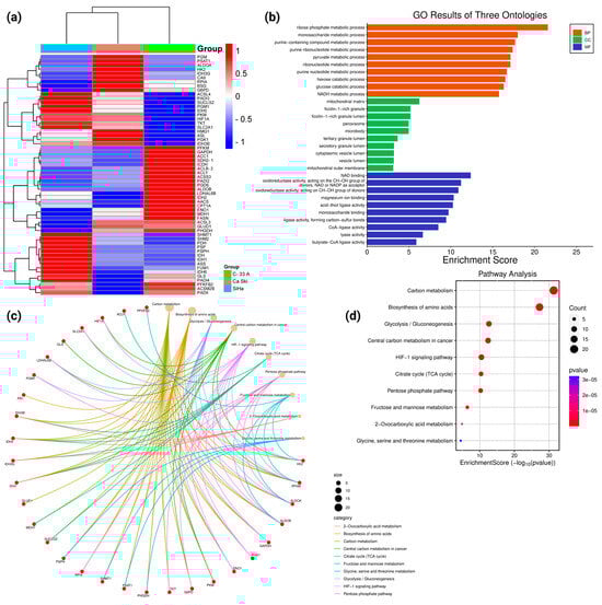 Expression and general biological functions in the cervical cancer cell lines C-33 A (in green), SiHa (in blue), and Ca Ski (in pink). In (a) differential gene expression between C-33 A, SiHa, and Ca Ski is depicted in the heat map. Panel (b) represents GO analysis from differentially expressed genes in C-33 A, SiHa, and Ca Ski. The colored bars represent the Gene Ontology for molecular functions (MF), molecular components (MC), and biological processes (BP). In (c), the cnetplot corresponding to the pathways mainly enriched by genes expressed in C-33 A, SiHa, and Ca Ski is represented. The colored lines correspond to the categories of each pathway, and the genes involved in each enriched pathway are shown. In (d), a score dotplot is shown representing the metabolic pathways enriched by genes expressed in C-33 A, SiHa, and Ca Ski cell lines. The size and color of the circles represent the proportion of enrichment. Graphs were obtained from analysis in the KEGG, GO, and GSA databases. The plots were obtained from SRplot. Significant enrichments were defined as |NES| > 1, NOM p. adjust < 0.05, and FDR q value < 0.25.
