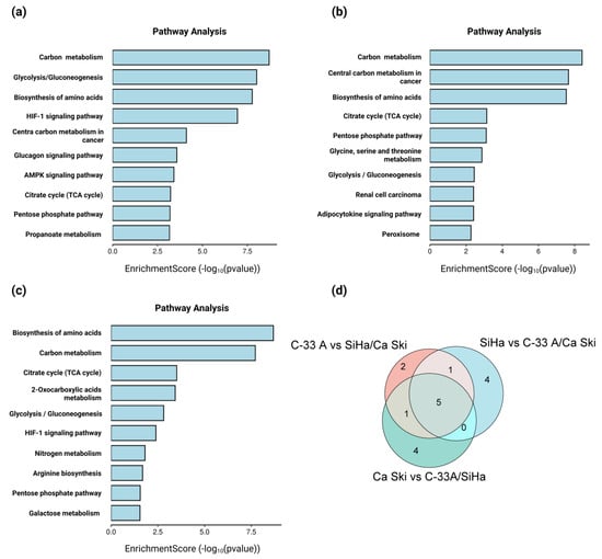 Pathway enrichment analysis of differentially expressed genes in C-33 A, SiHa, and Ca Ski cells. Panels (a–c) represent the metabolic pathways with the highest enrichment when comparing C-33 A vs. SiHa/Ca Ski, SiHa vs. C-33 A/Ca Ski, and Ca Ski vs. C-33 A/SiHa, respectively. In (d), the Venn diagram integrates the commonly enriched pathways in C-33 A vs. SiHa/Ca Ski (pink), SiHa vs. C-33 A/Ca Ski (blue), and Ca Ski vs. C-33 A/SiHa (green). Numbers represent common and specific pathways in the three cell lines. Graphs were obtained from the analysis in the KEGG and GSA databases. Graphs and Ven diagram were obtained from SRplot. Significant enrichments were defined as |NES| > 1, NOM p. adjust < 0.05, and FDR q value < 0.25.