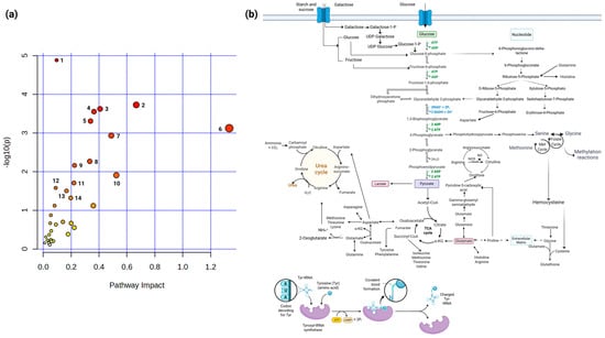 Metabolic pathways favored by the effect of HPV 16. (a) Enrichment of metabolic pathways favored by HPV 16. The overview shows all matching pathways according to the p-values from the pathway enrichment analysis and the impact values from the pathway topology analysis. Each node represents a metabolic pathway, nodes colored red and numbered 1 to 14 represent metabolic pathways with a p-value > 0.05. (1) Aminoacyl-tRNA biosynthesis; (2) Pentose phosphate pathway; (3) Arginine biosynthesis; (4) Valine, leucine and isoleucine biosynthesis; (5) Glycolysis or Gluconeogenesis; (6) Neomycin, kanamycin and gentamicin biosynthesis; (7) Citrate cycle (TCA cycle); (8) Nitrogen metabolism; (9) Glycine, serine and threonine metabolism; (10) Starch and sucrose metabolism; (11) Galactose metabolism; (12) Glutathione metabolism; (13) Alanine, aspartate and glutamate metabolism and (14) One carbon pool by folate. (b) The integration of the metabolic pathways favored by HPV 16 is shown. The diagram was constructed by synthesizing the metabolic pathways presented in panel (a), and each pathway represented by a node was retrieved from the KEGG database.
