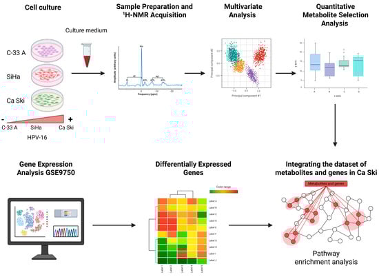 Exometabolomics is the study of how cells transform their environment via small molecules in culture media as a result of cell culture, typically by comparing media with different cellular conditions. Exometabolomics provides powerful insights into cellular phenotypes while circumventing the challenges of measuring intracellular metabolites, which are known to be altered and degraded within milliseconds of extraction [19,28]. This work focused on identifying potential biomarkers of CC diagnosis and progression by analyzing the exometabolomic profile using 1H NMR of three CC cell models with significant molecular differences: the C-33 A cell line (HPV-negative), SiHa cells (with one to two copies of HPV 16 DNA integrated into their genome), and Ca Ski cells (with about 600 copies of HPV 16 DNA in a mixed, genome-integrated, and episomal form) [29].