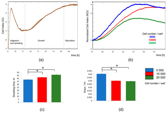 Growth curves of MSCs, based on cellular impedance measurements using the x-CELLigence system, were established according to the number of cells that were seeded in E-plates (from 5000 to 20,000 cells per well) to obtain the optimal cellular density. CI values were recorded in real time for a period of up to 160 h. As a whole, the impedance-based profiles showed the three phases of the cell growth curve (cell adhesion and spreading, cell growth phase, and stationary phase) (Figure 6a). After adhesion and spreading of cells, the CI values increased during the cell growth stage to reach the stationary phase. The CI values increased faster for MSCs that were seeded at a cell density of 5000 cells per well than for wells with higher initial cell densities (Figure 6b). The bar chart presented in Figure 6c shows the time required for a CI value to double. The doubling time parameter in the interval from 72 to 98 h was lower for MSCs that were seeded at a cell density of 5000 cells/well than for wells with a higher cell density. In contrast, the slope parameter corresponding to the growth curves of MSCs that were seeded at a cell density of 5000 cells/well was higher when a higher number of cells were seeded under the same conditions (Figure 6d). Thus, a cellular density of 5000 cells/well was selected as the optimum for cell seeding.