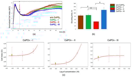 Real-time impedance analysis of MSCs treated with CePO4 NPs. (a) Response profiles of MSCs treated with 10−2 M CePO4-I, CePO4-II, and CePO4-III. The red arrow indicates the time after which the CePO4 samples were added to the MSCs. Curves represent the mean CI value from 4 wells ± SD. (b) CI doubling time for MSCs treated with 10−2 M CePO4 (I, II, III) in the interval from 24 to 48 h after CePO4 NP application. (c) The dose–response curves for CePO4 (I, II, III) at 48 h after MSC treatment. Data are represented as mean of n = 4 measurements ± SD. t-test, *—reliability of differences at p < 0.05.