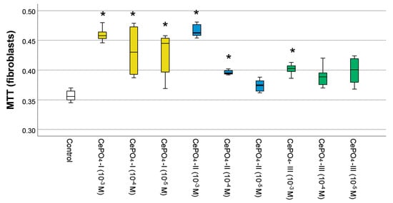 Effects of different synthesis options and concentrations of cerium phosphate nanoparticles on the metabolic activity of human fibroblasts in the MTT test (*—difference from control at p < 0.05; Kruskal–Wallis test). White is the control, yellow—CePO4-I, blue—CePO4-II, and green CePO4-III.