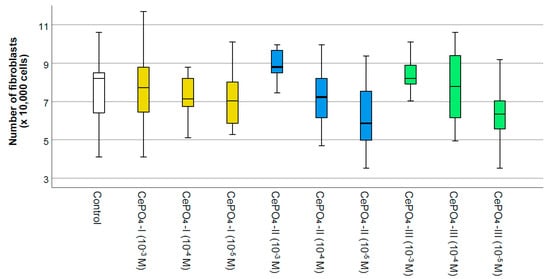 A count of the number of fibroblasts after 72 h of co-cultivation did not reveal any significant differences from the control, which on the one hand indicates the absence of cytotoxicity, while on the other hand indicating the absence of a significant stimulating effect on fibroblast proliferation. A tendency towards increased cell proliferation was only observed in the CePO4-II sample at a concentration of 10−3 M and in the CePO4-III sample at a concentration of 10−3 M (if the median is 1.07 times higher than the control, p > 0.05; if the average is 1.17 times higher, then CePO4-III at 10−3 M is 1.19 times higher, p > 0.05) (Figure 9 and Figure 10).