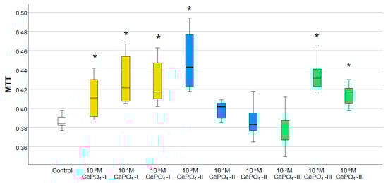 Effects of different synthesis options and concentrations of cerium phosphate nanoparticles on the metabolic activity of human keratinocytes in the MTT test (*—difference from control at p < 0.001; Kruskal–Wallis test).