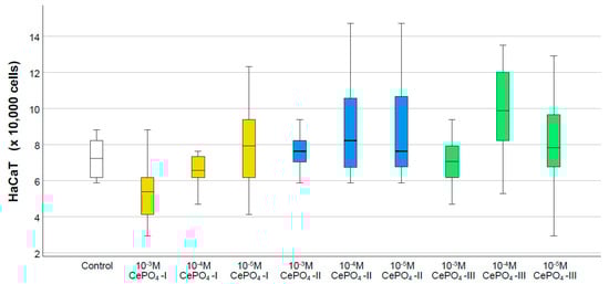 The counting of keratinocytes also showed that none of the ceria orthophosphates we studied had negative effects on the proliferative activity of HaCaT cells. Despite the fact that no statistically significant differences were found between the control and study groups, all concentrations of the CePO4-II sample were above the normal range (1.05–1.25 times on average), while CePO4-I was at 10−5 (1.09 times) and CePO4-III was at 10−4 M (1.36 times). The maximum cell number was recorded in the CePO4-III sample at concentrations of 10−4 M (an average of 36% or 1.36 times higher than the control) and at concentrations of 10−4–10−5 M in the CePO4-II sample (an average of 25% and 24% higher than the control, respectively) (Figure 12).