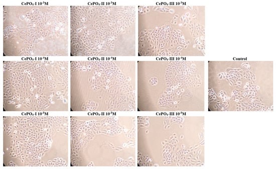 Photographs of human fibroblasts after 72 h of co-cultivation with CePO4 following different synthesis modifications and at different concentrations compared with control (magnification × 20).