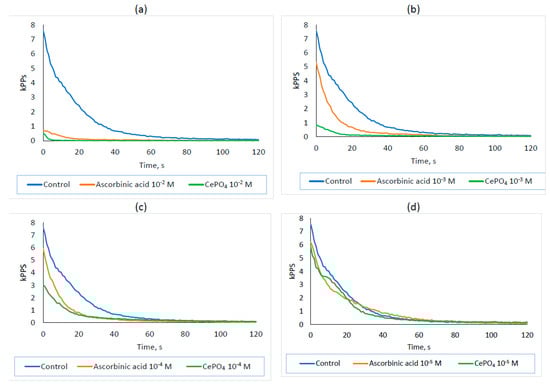 Kinetic profile of chemiluminescence of the reference experiment (control, blue line) and experiments with the addition of equal concentrations of cerium phosphate nanoparticles (green line) and the comparison sample with antioxidant ascorbic acid (orange line) at concentrations of (a) 10−2 M; (b) 10−3 M, (c) 10−4 M, and (d) 10−5 M.