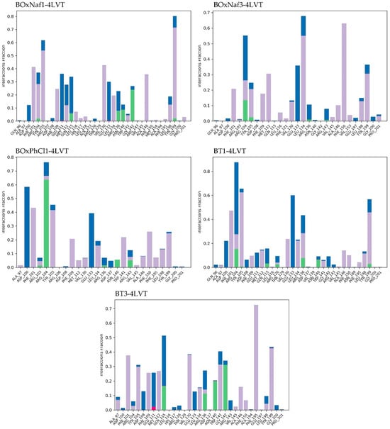 | BT3 | 1.0–2.0 (stable after equilibration) | 2.5–5.5 (mild fluctuation) | Asn140 (0.1–0.2), Gly142 (0.1–0.2) | ~8 residues | ~4 residues |