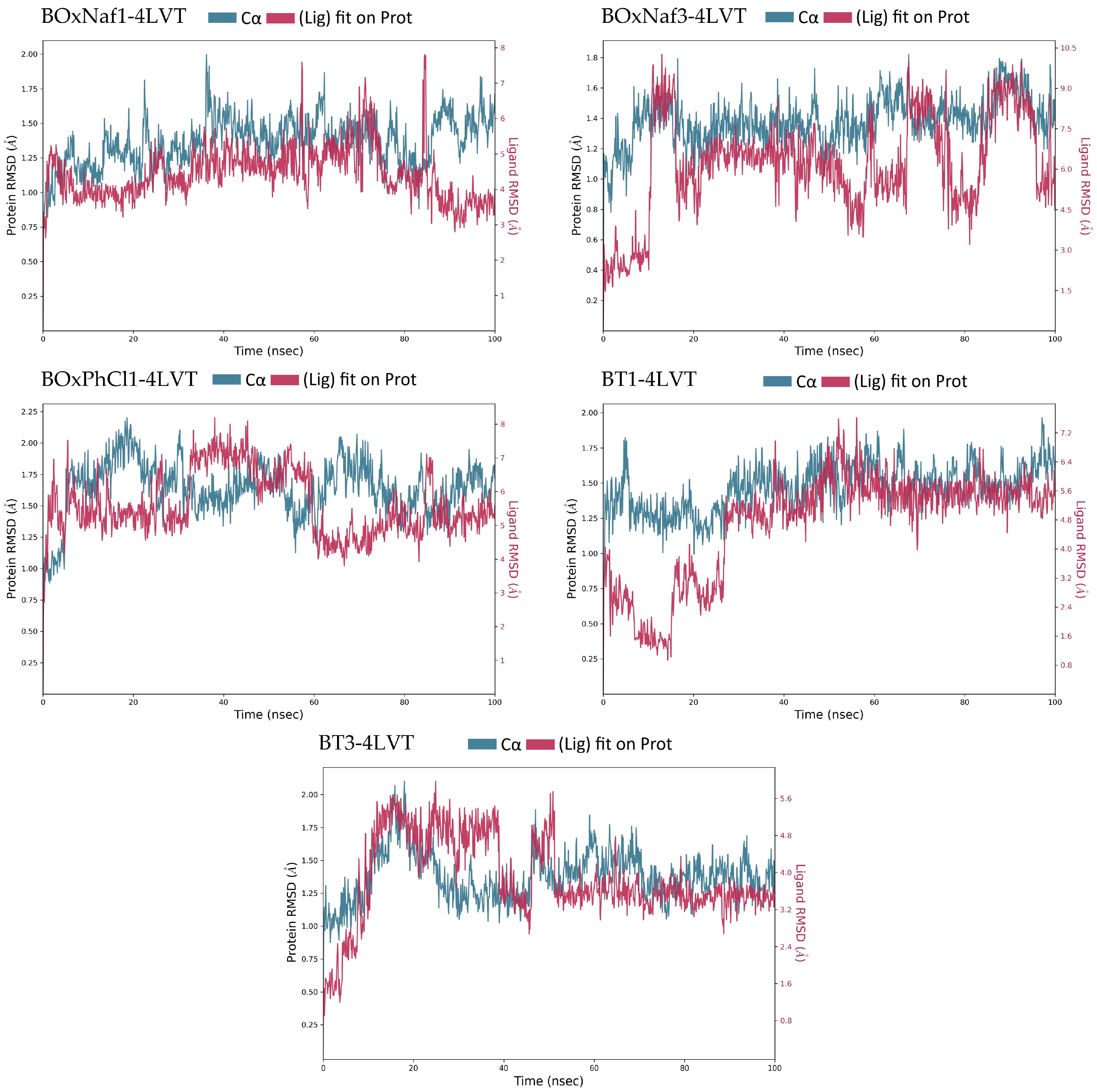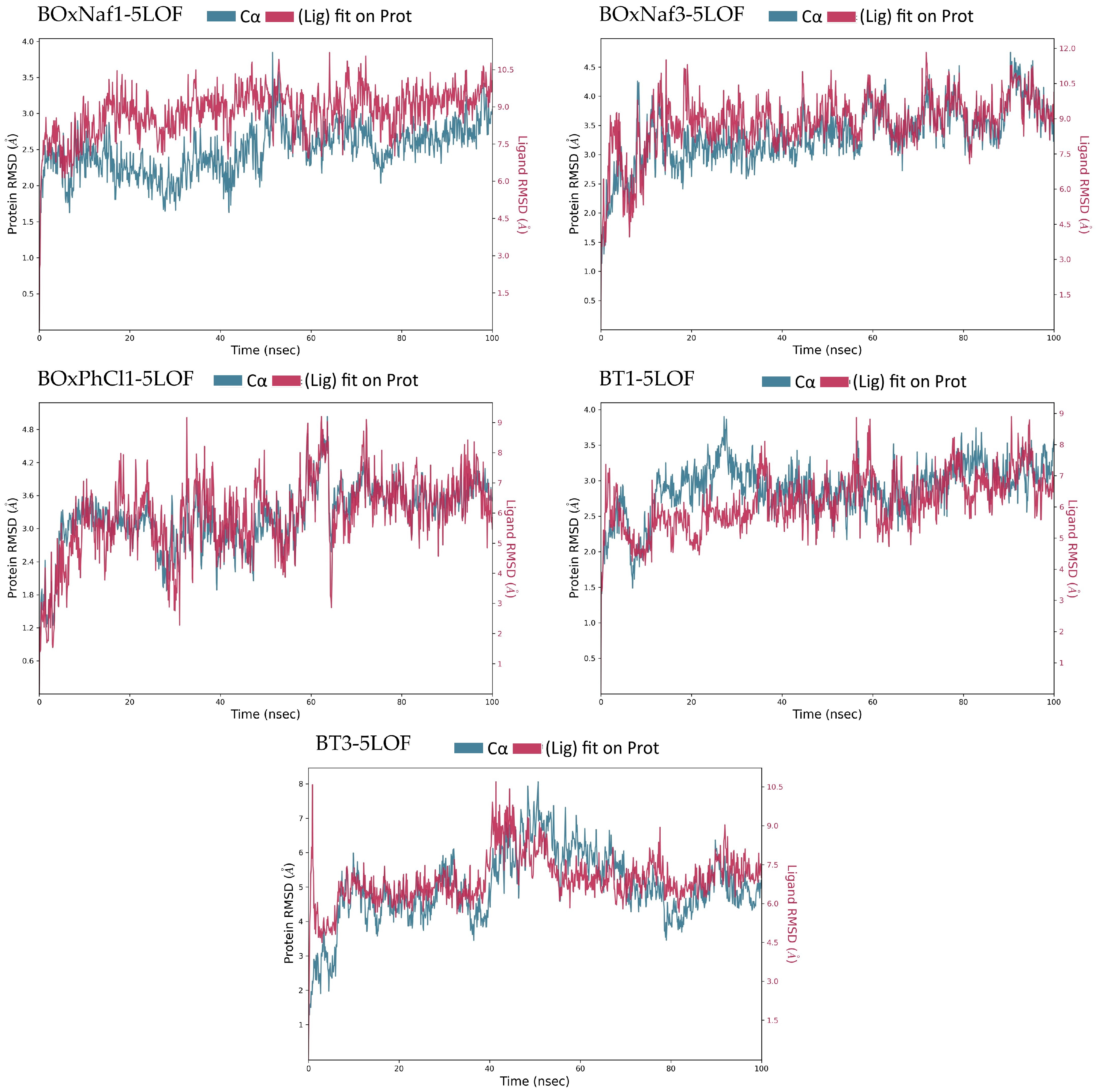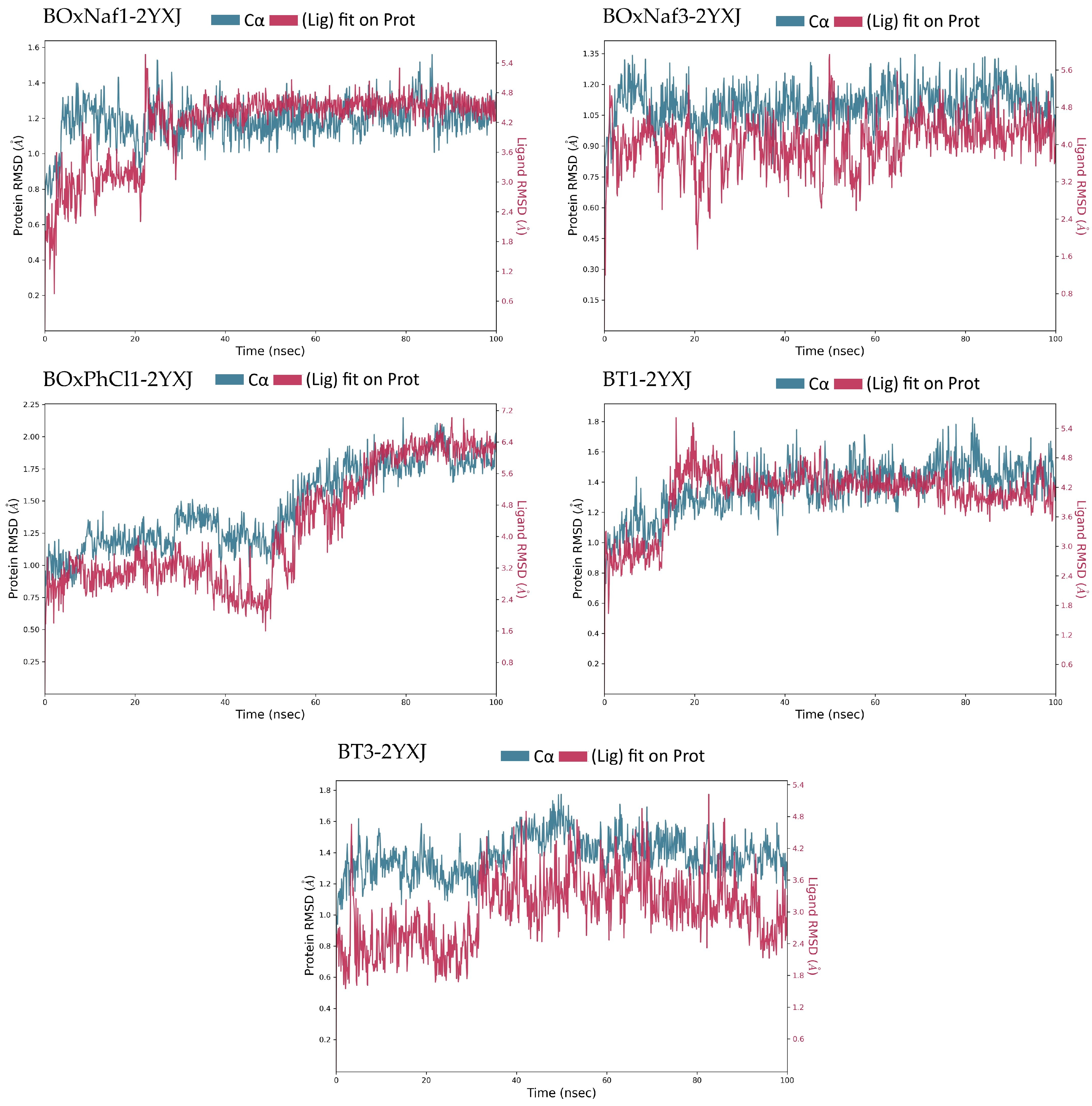 BOxNaf1 | ~1.0–1.3 (stable) | ~3.0–5 (stable after 20 ns: 4.2–5) | Arg100 (0.1–0.1) | ~11 residues | ~4 residues |