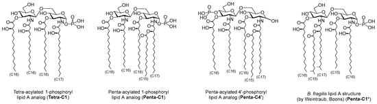 Interestingly, as early as 1989, Weintraub et al. proposed a lipid A structure for B. fragilis, characterized by a distinct pattern of fatty acid chains, including terminally-branched chains [26] (Penta-C1*, Figure 2), the same features that were later acknowledged in the more recent work of Kasper [24]. Furthermore, this structure was recently synthesized and immunologically evaluated [27]. The compound exhibited an antagonistic response towards the production of pro-inflammatory cytokines induced by E. coli lipid A, which is a natural ligand of the TLR4/MD-2 heterodimer [27].