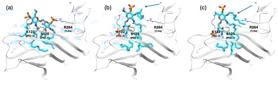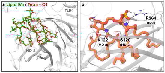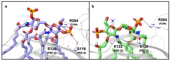 To investigate the binding features of the four compounds of Figure 2, we performed docking calculations in the agonist and antagonist models of TLR4/MD-2 dimer, generated starting from the corresponding X-ray structures (see Section 3 for details). The protein, the sugar core, and the first two torsions of each acyl chain were kept rigid during the docking calculations using AutoDock Vina [40,41]. For each ligand, we run docking simulations in triplicate and build two ligand conformations, one based on the crystallographic di-glucosamine backbone of lipid A bound to MD-2 (agonist-like structure, PDB ID: 3FXI [10]) and the other from lipid IVa (antagonist-like structure, PDB ID: 2E59 [30]) complex. E. coli lipid A is the active portion of LPS and acts as an agonist; lipid IVa is a tetra-acylated precursor of lipid A that binds to the same hMD-2/TLR4 complex without triggering the biological response. In the X-ray structures, lipid A and lipid IVa share a similar disaccharide conformation but exhibit an inverted orientation of the entire ligand within the MD-2 pocket, corresponding to a 180° horizontal rotation (Figure S1). In the agonist complex, the sugar moiety of lipid A interacts with residues S118 and S120 at the MD-2 surface, whereas in the antagonist structure, contacts are established with S120 and K122 residues. In both complexes, one phosphate group establishes an electrostatic contact with R264 on TLR4 (Figure 3).