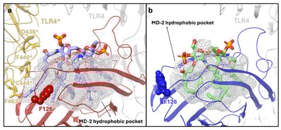 This interface, mainly formed by TLR4* residues (Q436, F440, L444, and F463, Figure 4a) and the F126 of the MD-2 loop, has a pivotal role in the recruitment of the second TLR4*∙MD-2*-LPS complex and in the formation of the signaling-competent multimer. Residue F126 is located at the entrance of the MD-2 binding pocket and, after the binding of the ligand, reorients its side chain and creates, together with one LPS chain, the hydrophobic pocket for the interaction with the second TLR4 protein. Site-directed mutagenesis studies confirmed that F126 is essential for receptor dimerization [28].