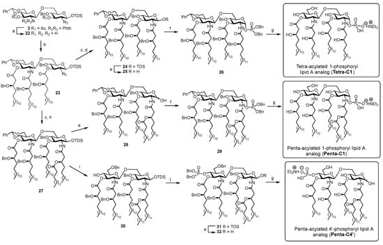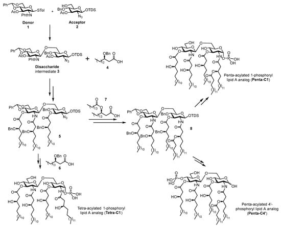 General scheme for the synthesis of lipid A compounds Tetra-C1, Penta-C1, and Penta-C4′.