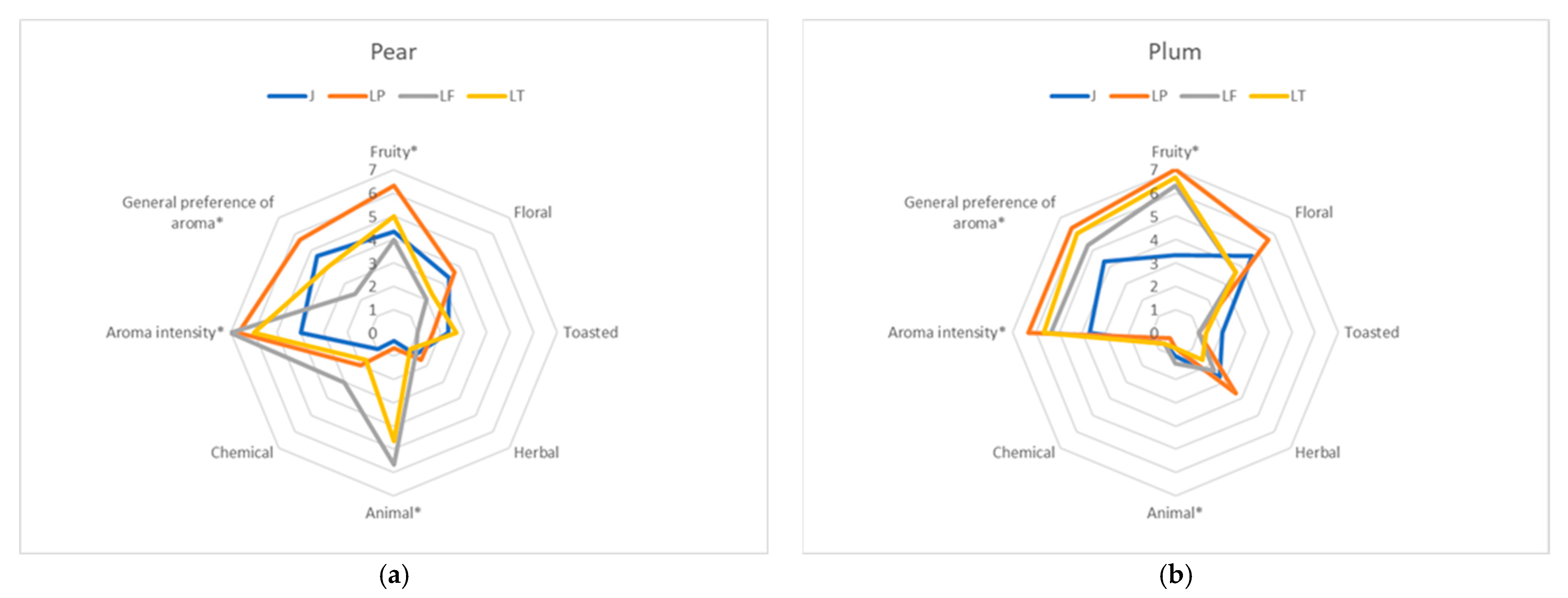 - Taiti, C.; Pandolfi, C.; Caparrotta, S.; Dei, M.; Giordani, E.; Mancuso, S.; Nencetti, V. Fruit aroma and sensorial characteristics of traditional and innovative Japanese plum (Prunus salicina Lindl.) cultivars grown in Italy. Eur. Food Res. Technol. 2019, 245, 2655–2668. [Google Scholar] [CrossRef]
