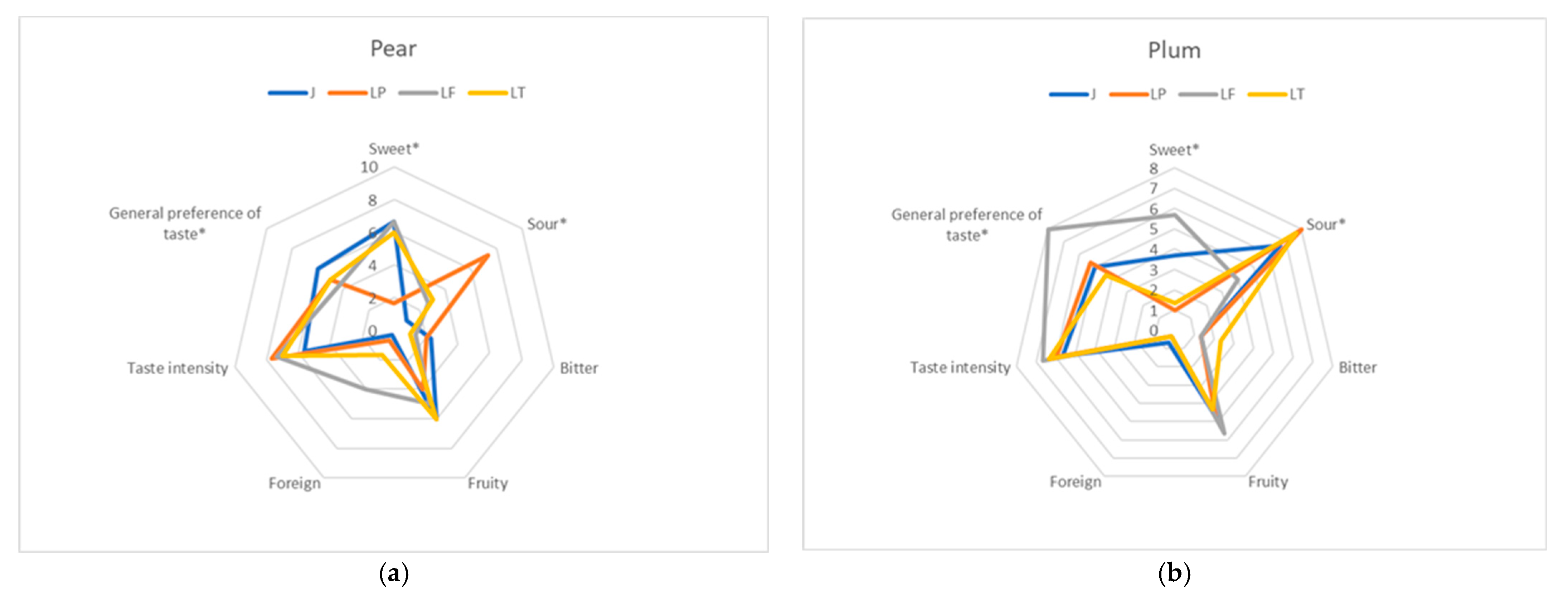 J | LP | LF | LT | J | LP | LF | LT | Fruit Juice | Fermentation | Fruit Juice × Fermentation | |