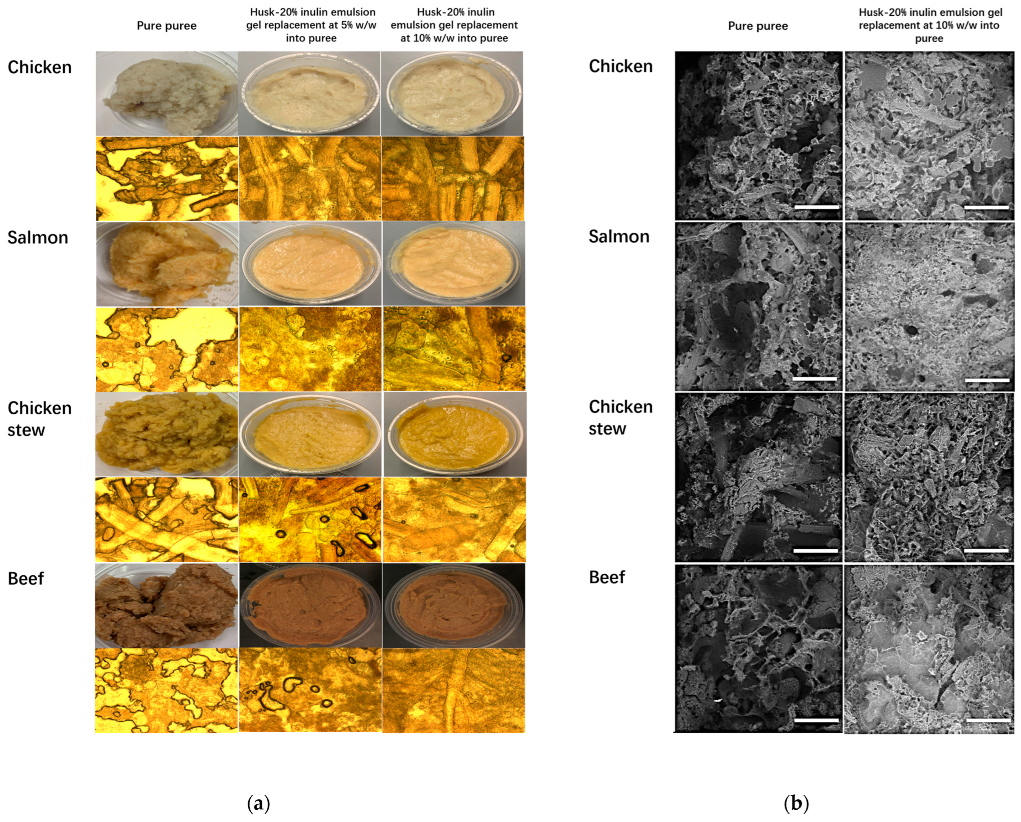 3.6. Cryo-Scanning Electron Microscopic Observation of Emulsion Gels and Puree Samples