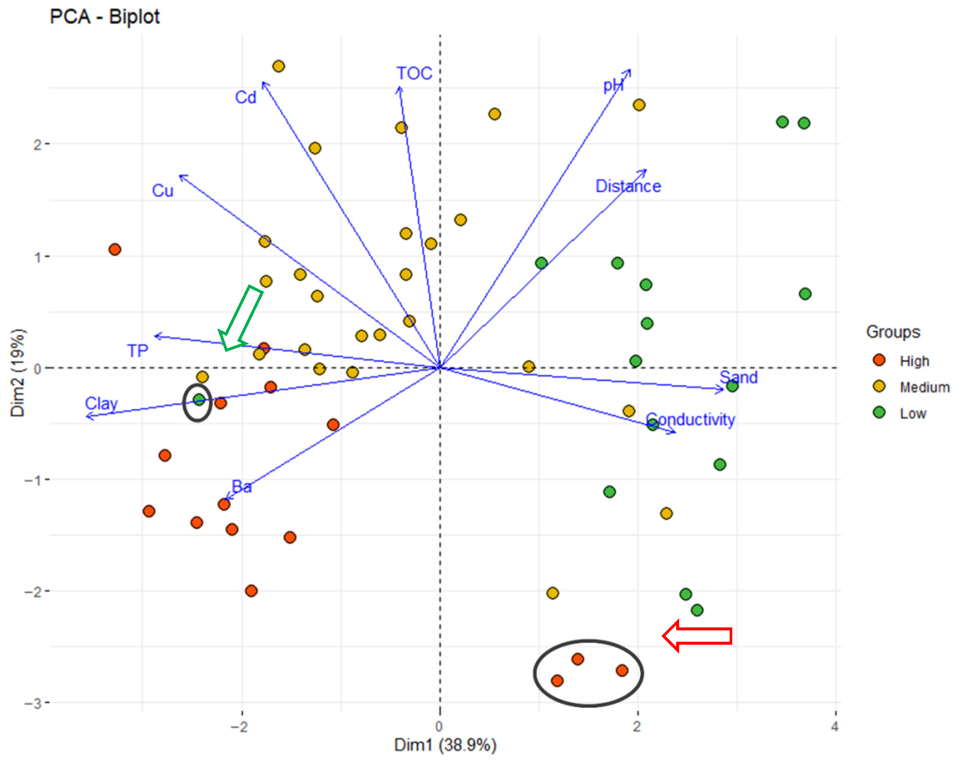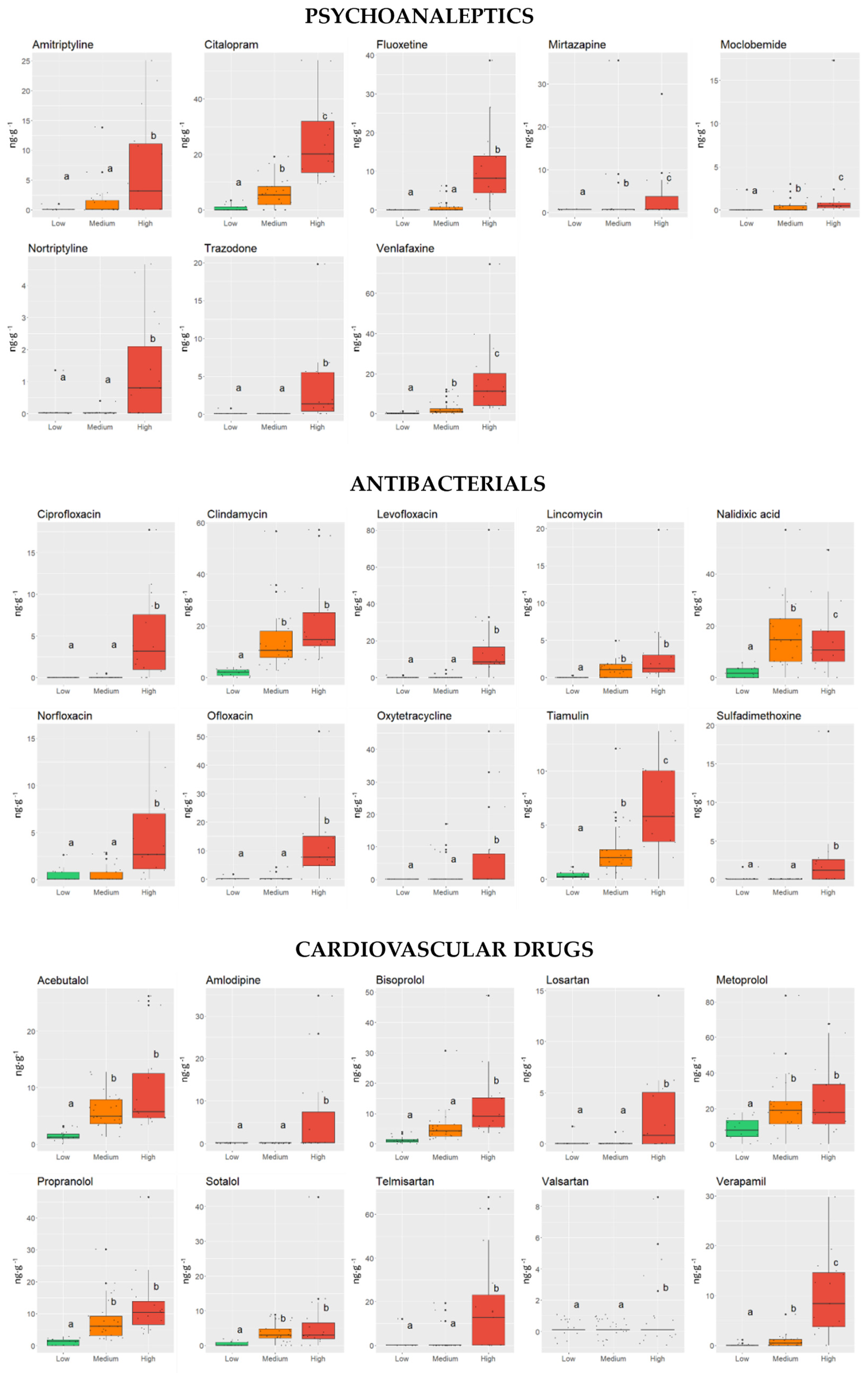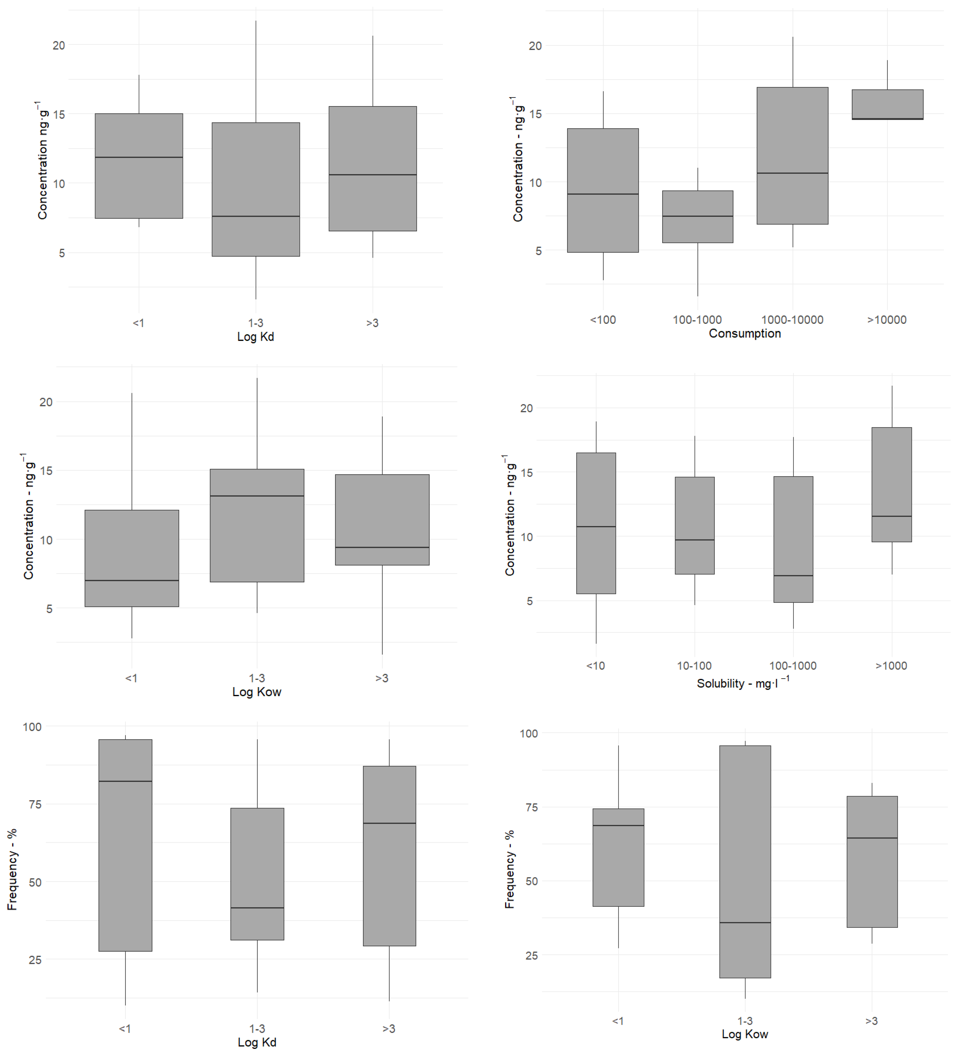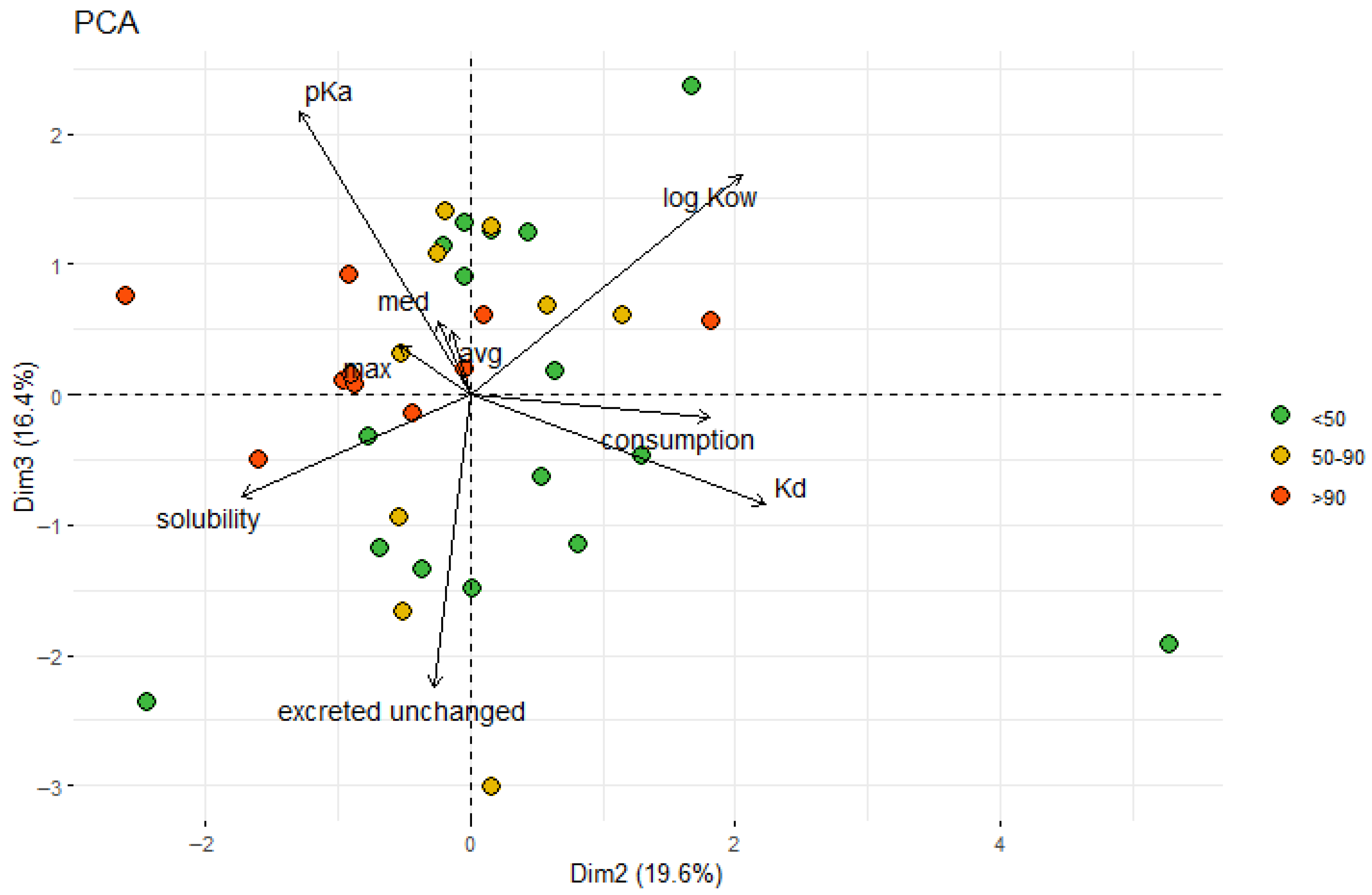 3.2. Influence of Physical and Chemical Parameters of PhACs on Their Occurrence in Sediments