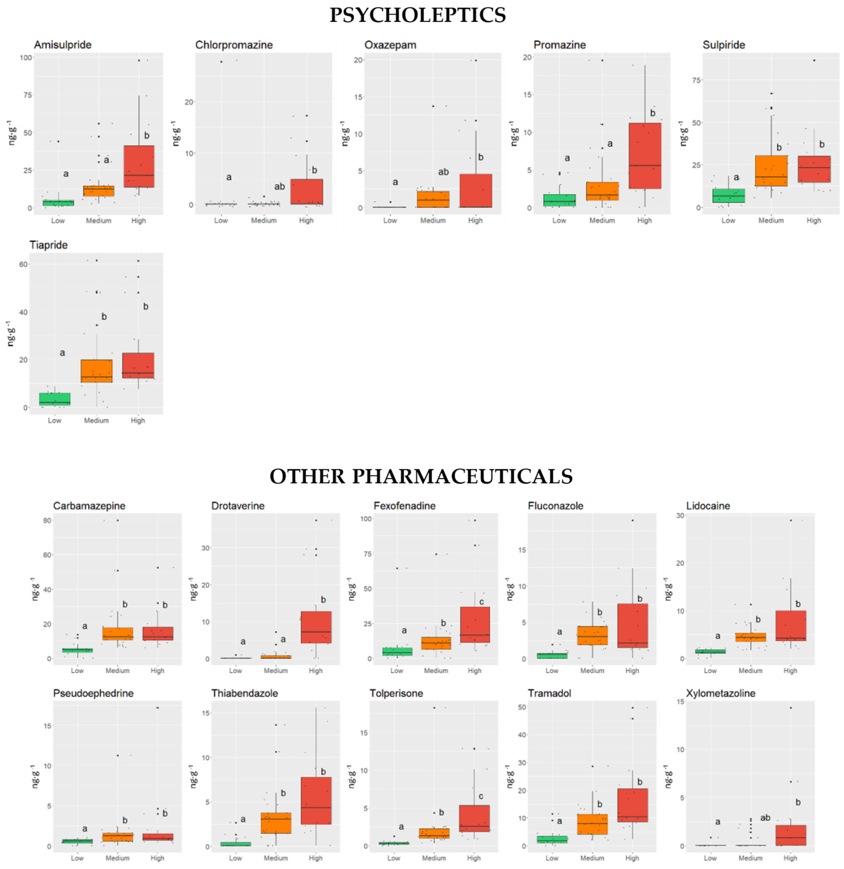 3.1. Influence of Physical and Chemical Characteristics of Sediments on the Occurrence of PhACs