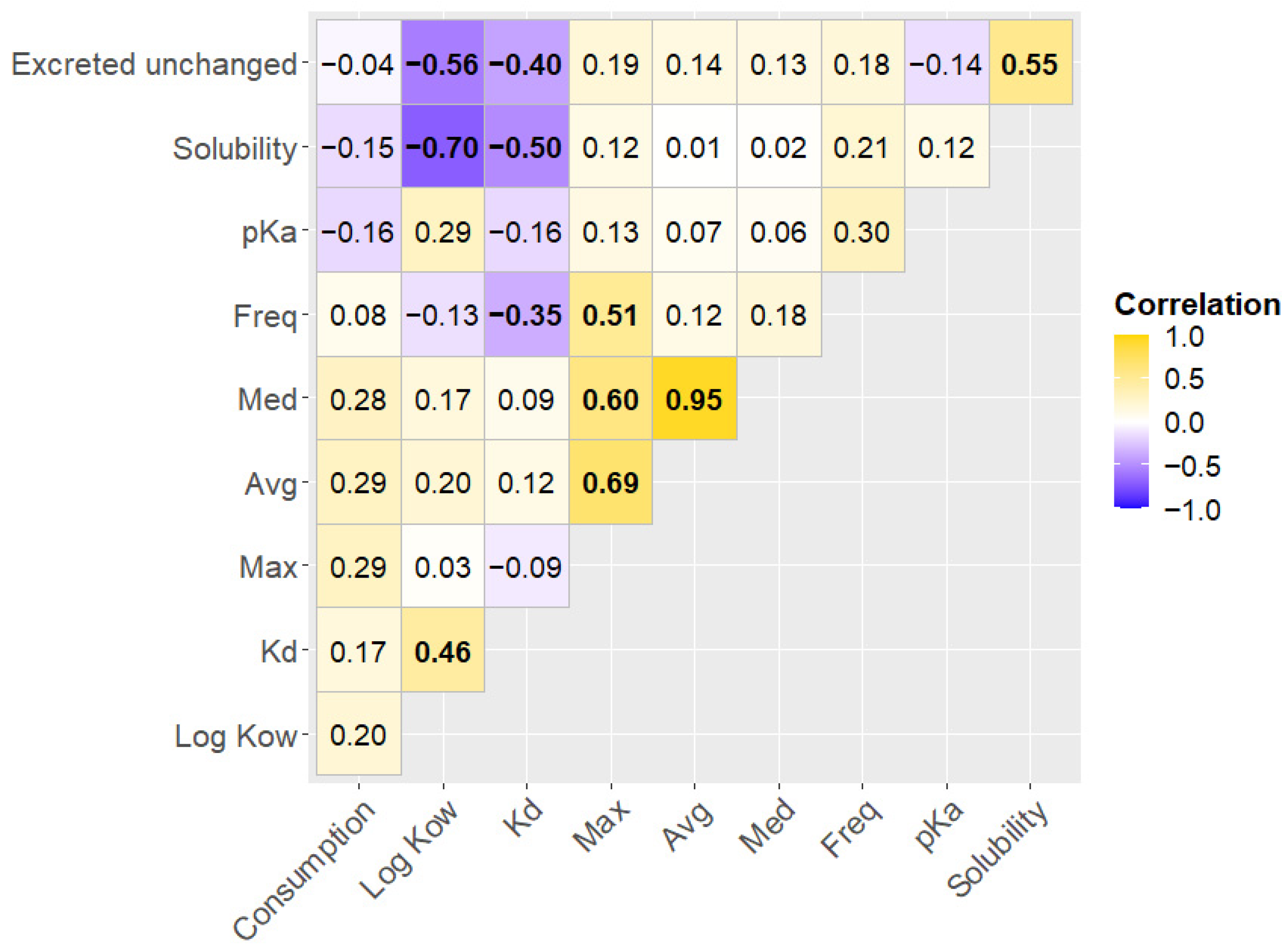 PhACs | Sale *, kg | log Kow (calc.) | Kd, L/kg (calc.) | Freq., % | pKa | Solubility, mg/L | Excreted Unchanged, % |