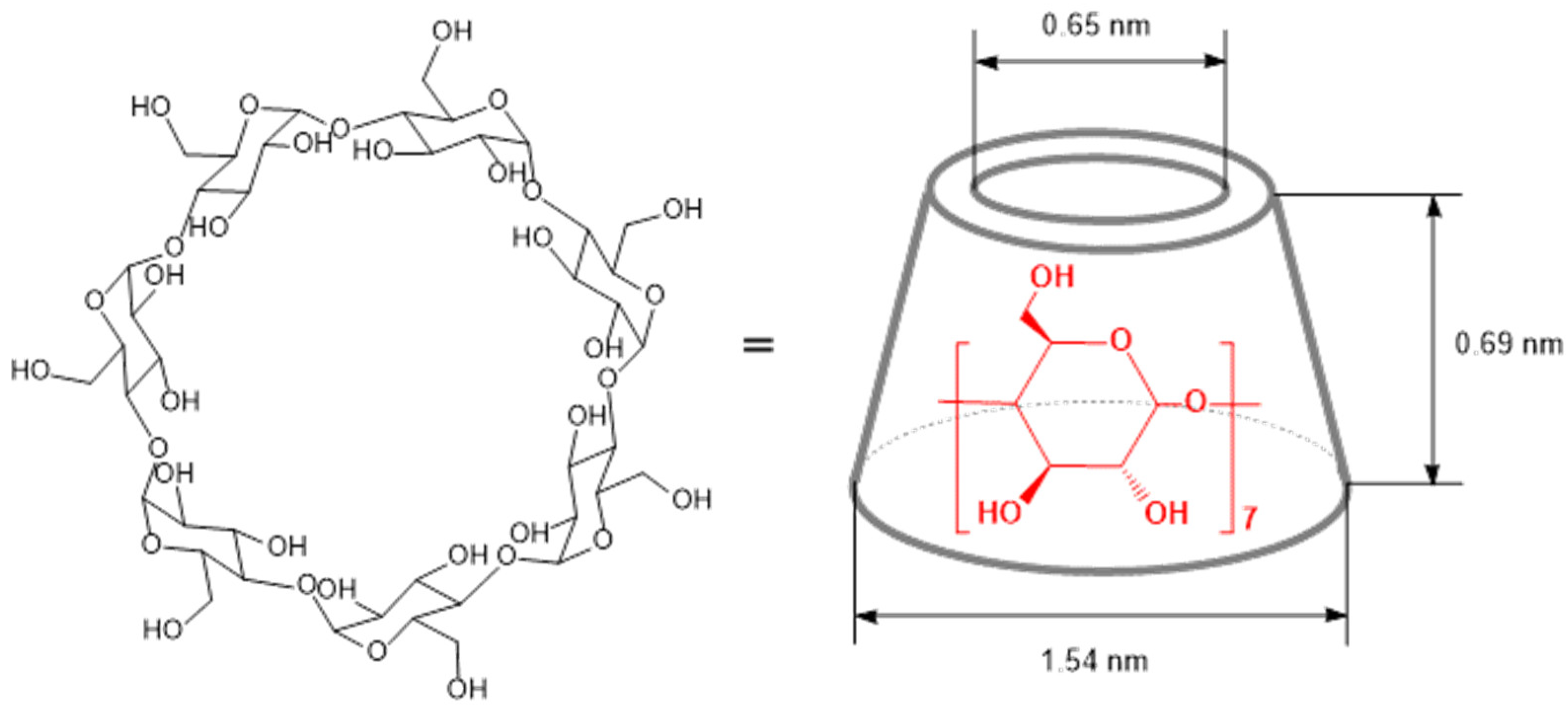 Due to their toroidal architecture and distinct physicochemical features—including the coexistence of hydrophilic outer surfaces and a hydrophobic internal cavity, localized electron-rich regions, and the presence of highly ordered water molecules within the cavity—cyclodextrins are classified as cage-type host molecules. In aqueous media, they are capable of forming inclusion complexes with hydrophobic guest molecules or hydrophobic moieties via non-covalent interactions, thereby altering the guests’ physicochemical and biological profiles [78,79,80,81,82].