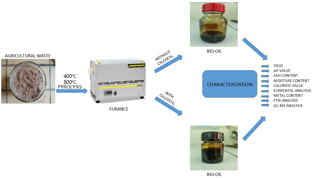 In more detail, in this work the liquid fraction was obtained by pyrolysis in a tubular furnace, using nitrogen as the carrier gas, at 400 and 500 °C, with and without acetone in the condensation trap. Two fractions were collected: the light fraction, containing water, hydrocarbons, and aromatic compounds with lower boiling points, and the heavy fraction, remaining in the tube, consisting of higher molecular weight compounds with higher boiling points. The separation of these bio-oil fractions may facilitate product handling by reducing the number of purification steps. The bio-oil was characterized by physicochemical parameters (pH, moisture content, ash content, and calorific value) and by elemental composition to evaluate the influence of acetone and possible environmental impacts, including the presence of toxic elements (Pb, Cd, As, Cr, Hg, Cu). In addition, the contents of total S, Si, Ca, K, P, and Mg were determined, as they are related to the amount of ash remaining after combustion. For insights into the molecular composition, FTIR analysis was performed and compared with the GC-MS results to provide a more detailed characterization of the bio-oil. This study compared the advantages and disadvantages of the pyrolysis process without the use of solvents and application of acetone as an efficient solvent for polar compounds in bio-oil condensation and separation, focusing on its impact on the physicochemical properties.